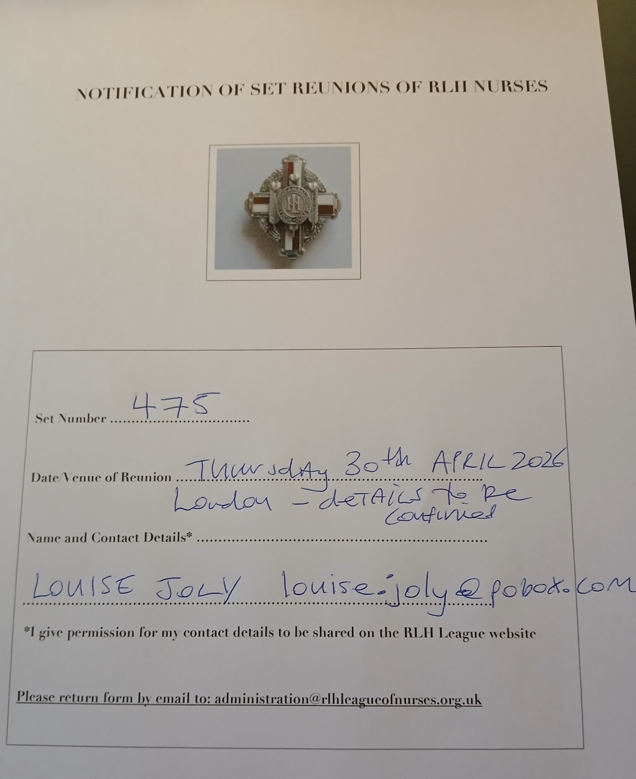 Reunion planned for Thursday 30th April 2026